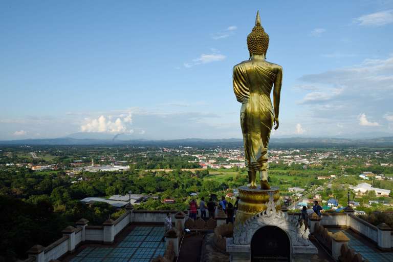 La religion tient une place capitale dans la vie des Thaïlandais. Le bouddhisme, teinté d’animisme dans les tribus du nord, régit la vie de tous les jours. Devant chaque maison ou commerce, les gens se recueillent en joignant les mains près du menton devant de petits autels chargés d’offrandes aux esprits. Dans chaque région, les temples (wat) reflètent l’architecture et le style décoratif des civilisations qui les ont influencées : l’Inde du sud au wat Chet Yod de Chiang Mai ; la Birmanie au wat Si Rong Muang de Lampang, rouge et or jusque sur ses toitures étagées, surchargé de dorures, de verres colorés et d’innombrables statues de bouddhas au regard bienveillant, sur lesquelles les gens pieux collent de petites feuilles d’or… Le wat Phumin de Nan abrite des peintures murales extraordinaires, véritables BD racontant la vie de Bouddha. Une fresque est particulièrement célèbre, celle de ce couple d’amoureux coiffés et habillés à la mode thaïe Lue, où un homme tatoué susurre des mots doux à l’oreille d’une femme au sourire complice, qui lui effleure le genou. Cette scène osée pour l’époque, reprise par tous les peintres et illustrateurs du pays, montre le vrai visage de la Thaïlande : une civilisation raffinée et délicate, à mille lieues des turpitudes de Pattaya ou de Phuket…