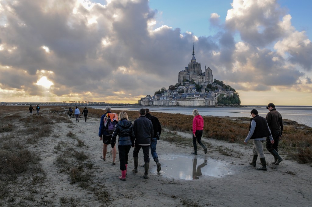 Jean-François Delanoë, guide naturaliste, attend que les touristes réunis autour de lui soient attentifs. Malgré le vent frais qui picote les joues, et le froid qui monte sans doute dans ses jambes (il est pieds nus !), Jean-François prend le temps d’expliquer le phénomène d’ensablement de la baie. Les sédiments s’accumulent, le niveau du sol monte de 2 à 3 cm par an, permettant à des plantes haliophiles (qui aiment le sel), de coloniser ce qu’on appelle les prés-salés. D’où le surnom des moutons à tête et pattes noires qui paissent là en liberté, sauf en période de grande marée, où la mer recouvre tout. On se penche pour ramasser quelques pousses de salicorne, plante comestible qu’on utilise ici un peu comme du cornichon. Mais il ne faut pas toucher à l’obione, plante protégée ! La promenade à pieds, ou mieux encore, la traversée de la baie, est une expérience indispensable pour bien comprendre la complexité et la richesse de l’écosystème de la baie du Mont-St-Michel. Bien entendu, il faut absolument suivre un guide, car se promener à pieds autour du Mont, même à marée basse, n’est pas sans danger. « A l’entrée de la baie il y a 15 m de marnage, c’est le plus haut d’Europe ! Pendant les grandes marées, la mer recule jusqu’à 15 km ! Et comme elle monte toujours plus vite qu’elle ne descend, le risque de se faire encercler est grand, car on ne la voit pas venir. C’est de là que vient la légende de la mer qui monte ici à la vitesse d’un cheval au galop. C’est faux, mais tout de même, elle peut monter jusqu’à 15 km/h ! Et à ce moment là, croyez-moi, vous n’avez pas le temps de vous enfuir… » prévient Jean-François, en rappelant que des imprudents se font régulièrement secourir par hélicoptère. Autre rumeur que se charge illico de démentir le guide, en joignant le geste à la parole : il y aurait des sables mouvants autour du Mont-Saint-Michel. « C’est partiellement vrai. En fait, il n’y a pas d’endroits qui vous engloutissent d’un coup, et la plupart du temps, les gens marchent sur du sable mouvant sans s’en rendre compte. D’ailleurs, on est sur du sable mouvant en ce moment même ! » ajoute le guide d’un air facétieux… Chacun regarde ses bottes avec un mélange d’incrédulité et d’inquiétude, quand Jean-François ajoute : « sautez sur place, s’il vous plaît ». On s’exécute docilement et pataugeons dans le sable humide, et peu à peu le sable s’efface sous nos pieds, emprisonnant vite nos bottes. « Stop ! Regardez maintenant !» crie le guide, hilare, qui se met lui-même à trépigner sur place. Petit à petit, Jean-François s’enfonce sous nos yeux ébahis, et s’arrête de gigoter quand il se retrouve ensablé jusqu’au bassin. Il ne peut plus bouger, et nous explique maintenant la technique nécessaire et les bons gestes à avoir (à part appeler au secours) pour se sortir de ce piège tout seul. Très impressionnant ! Mais il n’y a pas de danger si l’on ne s’attarde pas sur place. C’est comme la tangue (la vase). Lorsqu’il faut traverser ces étendues de vase grise et visqueuse, il faut marcher rapidement pour ne pas laisser le temps à la vase d’engluer la botte. Plus d’un étourdi y a laissé la sienne ! Une fois que l’on s’est habitué à progresser dans le sable, et à traverser les criches (rigoles creusées par la mer) sans encombres, on peut profiter du paysage tout en écoutant les commentaires historiques du guide, qui ne se lasse pas de gloser sur les Anglais qui n’ont jamais réussi à prendre le Mont-Saint-Michel, ni de s’extasier sur la prouesse de ces moines-bâtisseurs. Nous rebroussons chemin à hauteur de Tombelaine, cet autre rocher immergé dans la baie, qui est aujourd’hui une réserve ornithologique. Nous n’avons pas eu la chance d’apercevoir la colonie de phoques veaux-marins qui a établi domicile dans la baie, mais nous avons pu observer des aigrettes garzettes, des huîtriers-pies et de nombreux goélands. C’était une balade passionnante, vivifiante, mais aussi assez fatigante. De nombreux guides privés proposent leurs services pour traverser la baie, ou pour faire des balades commentées, que ce soit au départ du parking du Mont-Saint-Michel, ou au départ du Bec d’Andaine, de l’autre côté de la baie, vers Genêts. Les sorties varient de 2 h à 6 h, en fonction du parcours (de 5 à 15 km). En cas d’aller simple, retour en bus prévu.