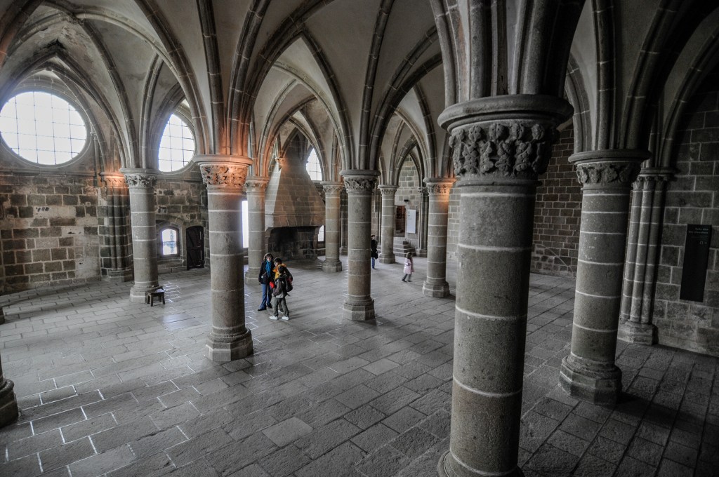 Puis nous entrons dans ce que l’on appelle la Merveille, un ensemble de six salles de l’abbaye. Dans le magnifique cloître, un esthétique jardin est entouré de fines colonnettes. Auparavant, les moines n’avaient droit qu’au jardin minéral sculpté sur les écoinçons. L’émerveillement est constant, en effet, du réfectoire très lumineux, à la crypte aux gigantesques piliers, en passant par la grande et belle salle des Chevaliers où les moines étudiaient… Devant l’énorme roue qui occupe l’ancien ossuaire des moines, Amélie questionne : « Devinez à quoi servait cette roue ? » Silence gêné… « …et bien c’était un monte-charge tourné par 6 hommes, comme des hamsters, en fait des prisonniers puisque le Mont-Saint-Michel a servi de prison de 1793 à 1863 ! » On sort généralement ravi d’une telle visite, avec le sentiment d’avoir appris beaucoup de choses, et d’avoir bien « compris » le Mont-Saint-Michel. Et l’on peut alors grossir le flot des badauds dans la rue principale, et se laisser aller à des plaisirs plus matériels et consuméristes, comme celui de manger une crêpe ou une glace (selon la saison), ou d’essayer de trouver un souvenir pas trop kitsch…
